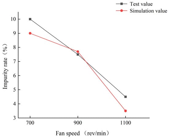 The impurity rate results from the simulation test and the test bench are depicted in Figure 10. As the fan speed increases, the impurity rate decreases, and the trend in simulation values closely aligns with test values, showing a maximum relative error of 15%, a minimum of 6.67%, and an average of 10.53%. The model demonstrates adequate reliability, thus enabling its application in future gas–solid coupling simulation studies.