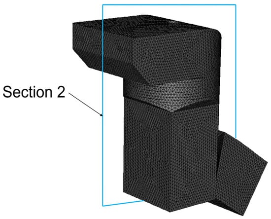 Figure 12 shows the velocity distribution contour map within Section 2 at different fan speeds. The velocity distribution inside the extractor is a crucial design parameter. A comparison of the three velocity distribution contour maps reveals, that with an increase in fan speed, the velocity values within most of the airflow field inside the fan also increase, while the distribution range remains relatively constant. The airflow field status of the extractor at a certain speed can be clearly observed from the graphs. Taking the velocity distribution contour map of Section 2 at 700 rev/min as an example: the velocity in the fan blade zone reaches a maximum value, with a maximum velocity of 23.2 m/s; the overall velocity in the material throwing zone is the lowest, with the lowest velocity being 2.6 m/s; the velocity in the outlet zone shows the greatest variation, ranging from 3.3 to 20.2 m/s; the material separation zone just below the blades exhibits relatively high and stable velocity, with an average velocity of 6.8 m/s and a velocity range of 5.7 to 11.3 m/s.