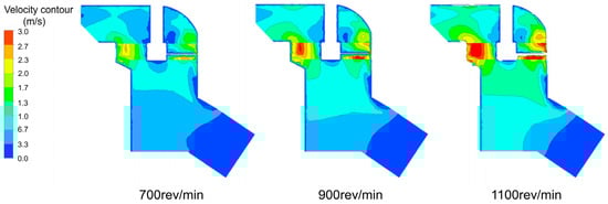 To delve deeper into the influence of fan speed on the airflow field, simulations were carried out to analyze the flow distribution at three distinct fan speeds (700, 900, 1100 rev/min). Subsequently, an analysis was conducted on the velocity and total pressure simulation results of Section 2, illustrated in Figure 11.