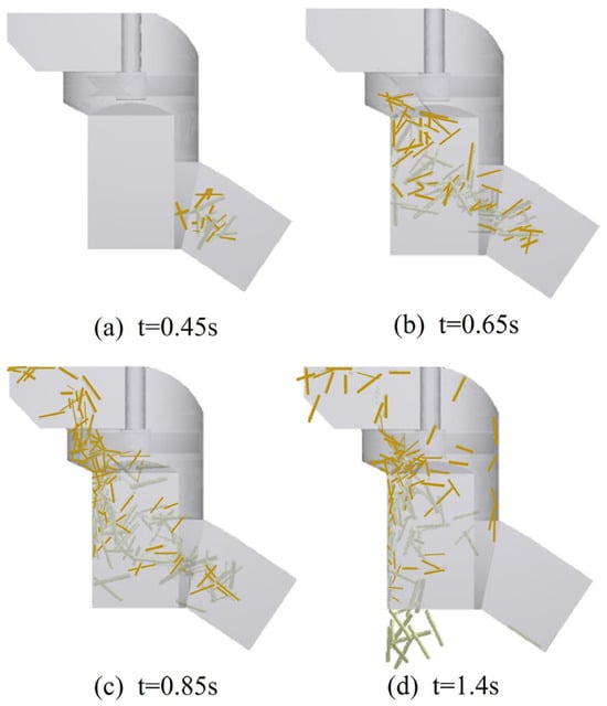 At 0.85 s, certain leaves traverse the fan blade and outlet zones, being expelled from the hood. Under the influence of the airflow field distribution, the majority of leaves swirl near the fan blade zone where wind speed and pressure are high. Numerous billets move forward due to inertia, colliding with the inner wall of the extractor. Some leaves that fail to separate promptly become intermixed and travel alongside the billets.