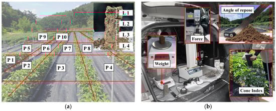 Soil properties were measured directly in an open field located at 18, Myeong-ri, Seohu-myeon, Andong-si, Gyeongsangbuk-do, Republic of Korea (36°36′10.4″ N, 128°39′41.03″ E). The field was divided into 10 sites by using the uniform grid SAMPLING method [], and one soil sample from each of the four layers (1st layer (L2): 5–10 cm; 2nd layer (L3): 10–15 cm; 3rd layer (L4): 15–20 cm; and 4th layer (L5): 20–25 cm) was taken from each site, as illustrated in Figure 1a, by using a sampling apparatus (4.7 cm in diameter and 15 cm in height) (SL09112, Shinill Science Inc., Paju, Republic of Korea). The soil sample from each depth was taken, maintaining its structure in the cylinder by removing the apparatus. Soil density was computed using the weight (PAG4102, OHAUS Co., Ltd., Parsippany, NJ, USA) and volume of each sample (referenced volume of soil sampling apparatus), and the Young’s modulus of the samples was determined using a universal testing machine (LTCM-100, Chatillon, New York, NY, USA) and force gauges (DFX 2, AMETEK. Inc., Pennsylvania, NJ, USA) (Figure 1b). The measured parameters of the soil samples were interactively utilized to determine the DEM input parameters. Finally, the soil samples obtained from each layer were dried in an oven (SN-110, Shinnong Co., Ltd., Gimcheon, Republic of Korea) at 110 °C for 24 h to determine their moisture contents [,].