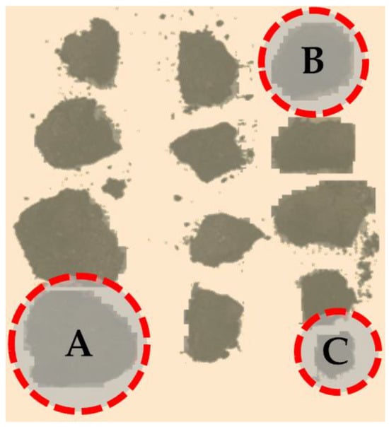 Considering the properties of manure, pig manure was used in this study (Figure 2). The particle shape was assumed to be spherical, and the particle size was categorized based on four classes of lump sizes (A: 50 mm, B: 40 mm, C: 30 mm, D: remained). Then, the distribution of the four classes was applied in the DEM analysis. Bulk density was determined by filling the cylinder to 150 mL [] with manure and weighing it on a scale (PAG4102, OHAUS Co., Ltd., Parsippany, NJ, USA). Finally, the manure was oven-dried at 103 °C for 24 h to determine its moisture content [].