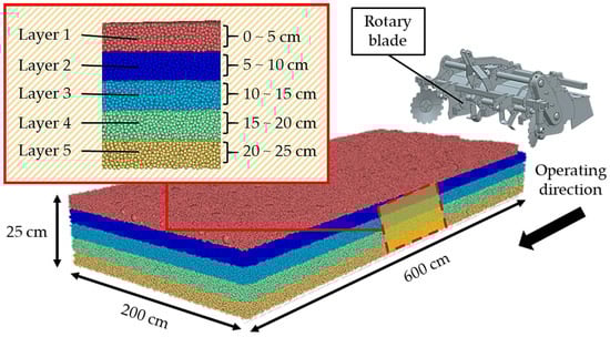 Spherical soil particles were obtained using a soil bin with a radius of 0.7 cm, which was selected considering the simulation accuracy and time []. Moreover, manure particles with the same shape were created with the abovementioned size distribution (0.7, 3, 4, and 5 cm). The total number of particles in the soil bin was 1,159,534. The soil bin was created virtually with a width of 200 cm, a length of 600 cm, and a depth of 25 cm. The soil particles were placed in the bin in order of depth, and manure was sprayed on the top layer (Figure 4). Then, rotary simulation was conducted using different tillage depths (23–25 cm), PTO revolution speeds (440–800 RPM), and forward velocities of the machine (1.2–2.4 km/h) by referring to the literature.