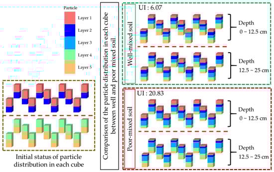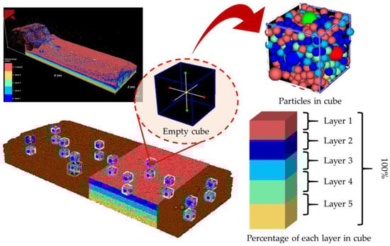 To determine the UI, the proportions of the particle numbers belonging to different layers in a unit volume were computed. The unit volume of cubes in the 125 × 10−6 m3 was used to count the number of particles; the process was simultaneously conducted at 22 different locations with double layers. The 1st and 2nd layers were placed at depths of 0–12.5 cm and 12.5–25 cm, respectively (Figure 5). The average proportion was taken as the UI, according to the following equation: