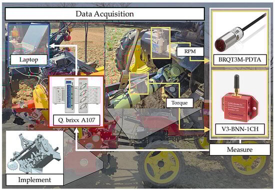 The rotary operation for experimentally studying the effects of the suggested operating parameters on soil distribution was performed with the data acquisition system (Figure 6). A torque measurement system was constructed to measure the torque acting on the PTO shaft and the revolution speed of the shaft by using a strain gauge equipped with a transmitter (V3-BNN-1CH, SMART C&S, Daejeon, Republic of Korea) and a photosensor (BRQT3M-PDTA, Autonics, Busan, Republic of Korea). This torque measurement system was installed on the surface of the PTO shaft, and an RPM measurement system was installed on the PTO frame box by using a magnetic support jig to ensure that the system could not detach or fall off during data acquisition. The field test was conducted with a travel distance of 10 m, and the operating soil depth was measured at intervals of 1 m, including the start point.