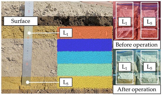 Furthermore, the selected method for the formula for calculating the distribution of soil, UI, based on analyzing significant variation from the mean value, seems to have been adopted in general agricultural data analysis []. Compared to other DEM literature results using an adhesive soil model, the selected operation condition in this study can be a more effective method by which to create a uniform soil environment in which a similar level of the distribution index was found at each soil depth in this study, while increasing significant variations were observed []. However, Song et al. (2023) discussed influencing factors that make soil cultivation more complex and decrease simulation accuracy []. Similarly, the validation test in this study was performed through an open field test, while some of the instances in the literature used an indoor schematic system [,,]. The aim of this study was to create a soil environment containing uniform nutrients at each depth. Therefore, performing the outdoor validation test can be a suitable method, taking the natural nutrient itself rather than using second-treated soil for making the soil bin.