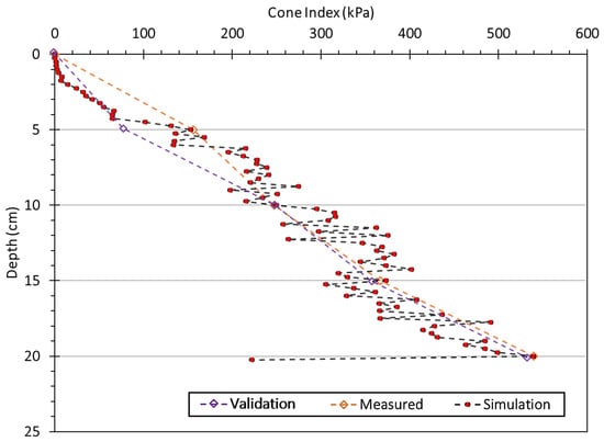 The DEM particle was calibrated by performing a penetration test. In the Rocky-DEM simulation, each particle layer was created in the cylinder (10 cm in diameter and 25 cm in height), and the cone tip was pushed into the cylinder at a velocity of 0.3 m/s [,]. The corresponding cone index with soil depth (Dn) is depicted in Figure 8. The cone index values of D1, D2, D3, and D4 were 151.1 kPa, 252.5 kPa, 375.0 kPa, and 549.4 kPa, respectively, and the differences between the measured and simulated values were 3.2%, 2.1%, 2.2%, and 1.9%. The cone index of the site was smaller than 600 kPa, indicating the presence of soft soil that had been tilled recently. Moreover, in the validation test, the cone index values at each depth in the field site were 78.6 kPa, 247.7 kPa, 349.3 kPa, and 524.8 kPa, which were similar to the values at D2, D3, and D4; however, the value at D1 was smaller than that obtained from the soil sample (Figure 8).