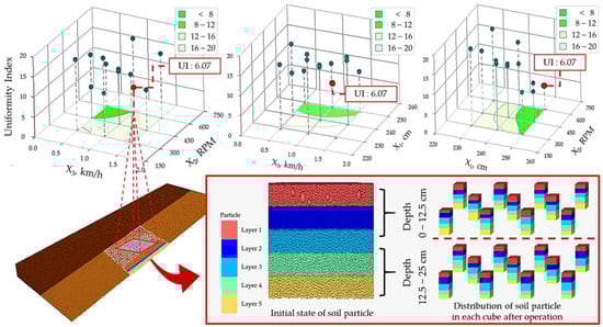 The number of particles belonging to each layer was analyzed using the cubes located at different soil depths. Initially, each particle layer was separated into five layers in the forward direction, and during DEM analysis, these layers were mixed and displaced in the cube located in the back section of the soil bin. Based on the selected experimental factors, the most well-mixed soil distribution was obtained when the UI value was 6.07 (Figure 10). This UI value represented small RMS differences between the layers and reflected the uniform distribution of soil particles within the bin. The effects of X1 and X2 on UI seemed intuitive; as the penetration depth of the implement into the soil and the rotating frequency increased, the interchangeability between each of the particle layers increased. Interestingly, level 0 of X3 yielded the lowest UI, which was counterintuitive because neither the longer nor shorter operating time resulted in a well-mixed field site. Considering the operation factors, similar results of the distribution tendency were found with the slower forward velocity through five different soil depths [].