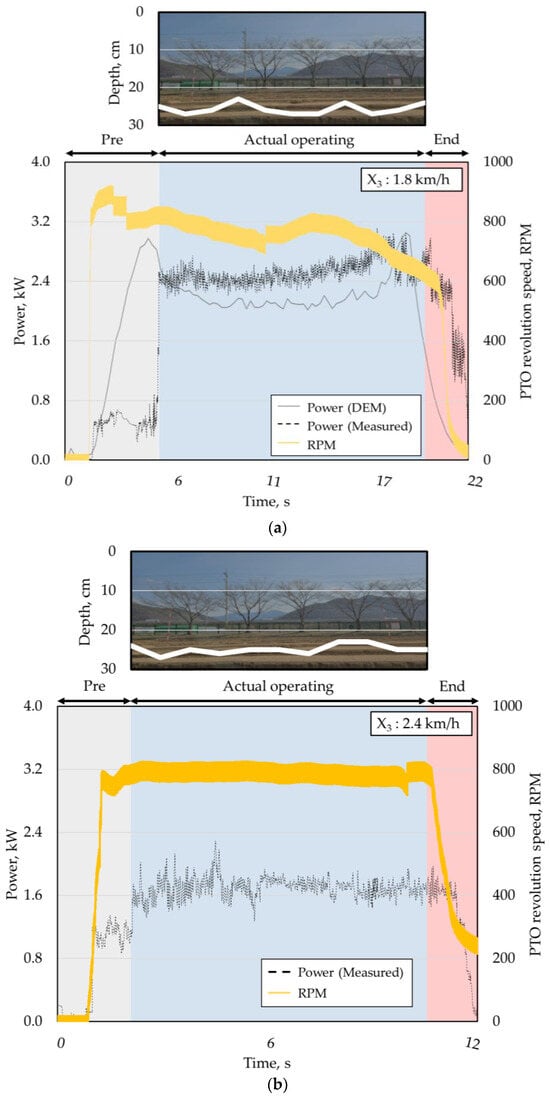 Based on the DEM result of design #5, a rotary operation was performed in the field to measure the required power. In addition, a comparative test in which X3 was increased to a higher level (2.4 km/h) was performed to analyze the counter-intuitive effect of this design factor on the UI value. The results of the field test for measuring the power, the sustained PTO revolution speed, and the soil depth at a forward machine speed of 1.8 km/h are presented in Figure 11a. While fluctuating power and RPM curves were observed in the latter part of the test owing to an adjustment of the machine to the travel environment, the average power was 2.4 kW, and the sustained PTO revolution speed was 800 RPM within the actual operating period; for the same design set, the required power according to the DEM result was 2.2 kW. Compared to the target depth of 25 cm, the minimum and maximum operated depths were 23 and 27 cm, respectively, and the average soil depth of 11 points was 25.6 cm (Figure 11a).