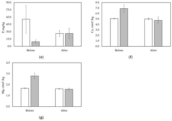 Comparison results of soil distribution in terms of chemical characteristics before and after rotary operation (a) pH, (b) EC, (c) organic matter, (d) K, (e) P, (f) Ca, (g) Mg (white bar: L1, gray bar: L5).