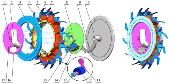 Structure of the rotary type-hole dibbler. (1) Shaft, (2) seed tube, (3) dynamic ring, (4) waist belt, (5) duckbill dynamic plate, (6) spring, (7) duckbill fixed plate, (8) fixed plate, (9) gear plate, (10) moving plate, (11) shifter, (12) type-hole wheel, (13) torsion spring, (14) disrupter, (15) disrupter support frame, (16) sight hole cover plate, and (17) end cover.