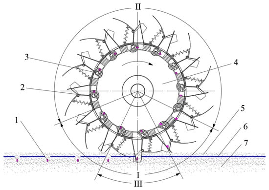 Working principle of the rotary type-hole dibbler. (I) Seed picking and cleaning, (II) seed storage and dropping, (III) hole forming and seeding. (1) cotton seeds, (2) duckbill, (3) type-hole wheel, (4) dibbler, (5) soil on plastic film, (6) plastic film, and (7) soil under plastic film.