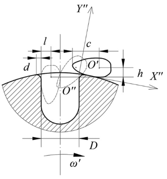 When the cotton seed is in an inverted position and needs to enter the type hole, the maximum distance of movement is required. We assume that the cotton seed approaches the type hole with its germ end, the coordinate origin is at the top right point of the type hole, the X-axis is the tangential direction of the seeding wheel rotation, and the Z-axis is the normal direction of the seeding wheel. When the center of gravity point O′ moves directly above the edge of the type hole, a gap is generated between the lower side of the cotton seed’s center of gravity and the edge of the type hole. Under the influence of gravity, the cotton seed begins to flip counterclockwise until it completely enters the type hole. As the cotton seed enters the type hole, its motion is similar to free falling and rotational motion, and the trajectory of the motion is approximately parabolic, as shown in Figure 3.