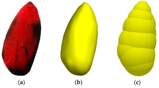 The coated cotton seeds are similar to ovals. This study utilized reverse engineering technology to obtain an accurate contour model of the cotton seeds. A Capture MINI scanner (3D Systems) was employed to perform a three-dimensional (3D) scan of the outer contour of the cotton seed, and Geomagic Wrap 3D 2017 (3D Systems) was used to process the 3D scanning data. Figure 4 presents the process adopted for the cotton seed contour model. The physical coated cotton seed is depicted in Figure 4a. The 3D scanning data were employed to derive the point clouds of the coated cotton seed. The point cloud data were preprocessed to remove noise points from the original point cloud and compress it. It was then encapsulated to form a polygon model. Automatic curvature repair was applied to the missing areas in the polygon model to obtain the contour model of the coated cotton seed, as shown in Figure 4b.