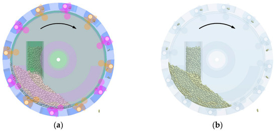 The total simulation time is set as the same value for EDEM and RecurDyn in the coupling interface, and the time step in RecurDyn is fixed as an integer multiple of that in EDEM. Here, the time steps in RecurDyn and EDEM are set as 0.01 s and 2.5 × 10−6 s, respectively. Once the parameters are set, the coupled simulation commences. After coupling, cotton seed particles also appear in RecurDyn, as shown in Figure 5. The movements of the components of the seeder and the cotton seed particles are simultaneously displayed in the two software, with arrows indicating the rotation direction of the conveyor belt.