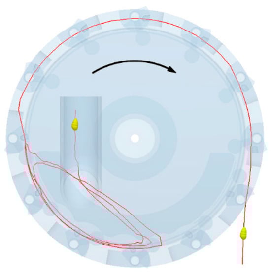 In EDEM, a cotton seed particle that has been successfully picked and discharged by the type-hole wheel is selected to generate the motion trajectory (Figure 6). The cotton seed enters the seed chamber from the seed drop tube, follows the rotation of the conveyor belt, and revolves with the seed group. It then moves from the bottom to the top of the conveyor belt, falls back to the bottom, and enters the hole of the type-hole wheel. When the hole of the type-hole wheel rotates back to the seed storage bin, the cotton seed reaches the seed storage bin and is discharged under the action of gravity.