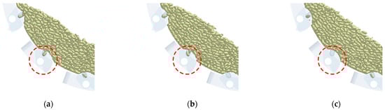 The simulation planting operation status has three key forms, namely single seeding (1 seed), double seeding (≥2 seeds), and missed seeding (no seed). To facilitate the observations of cotton seed movements, during the EDEM simulation process, only cotton seed particles within the seed disc thickness in the seed metering device are selected during seed retrieval. Moreover, the transparency of all mechanical components is set to 0.1 (Figure 9). Figure 9a depicts the qualified sowing state, where the type-hole wheel typically takes out a single cotton seed from the group of seed particles and transfers it to the seed storage bin through the type hole. Figure 9b shows the re-sowing state, where the type-hole wheel takes out multiple cotton seeds from the group of seed particles and transfers them to the seed storage bin through the seed-type hole. The cotton seed status in the type holes under multiple double-seeding states reveals that smaller cotton seeds are more prone to double-seeding. This is because when the size of cotton seeds around the type hole is small, it is easier for two or more cotton seeds to enter the hole under their own gravity and the compression of other cotton seeds. This makes it difficult for the seed cleaning plate to remove them from the type hole. Furthermore, in the double seeding state, the two cotton seeds in the type hole are mostly overlapping. Figure 9c presents the skip sowing state, where the type-hole wheel fails to smoothly remove the cotton seed from the group of seed particles. The cotton seed status around the type hole under multiple missed seeding states indicates that larger cotton seeds are more likely to experience missed seeding. This is because when the size of the cotton seeds around the type hole is large, the cotton seeds have difficulty entering the type hole under their own gravity and the compression of other cotton seeds, leading to unsuccessful seed retrieval. In addition, when a cotton seed is about to enter the type hole, it escapes from the hole due to the compression of the surrounding cotton seeds, resulting in failed seed retrieval.