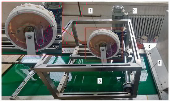 Seed planting performance evaluation test; (1) the rotary type-hole dibbler, (2) the motor, (3) the transmission shaft, (4) the conveyor belt, and (5) the fixed bracket. The red boxes and arrow represent enlarged view of the dibbler.