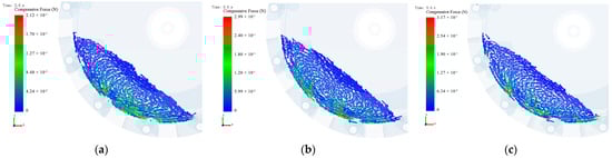 Figure 11 presents the vector diagram of the compression force of cotton seeds at 5.6 s when the rotational speed of the planter is 20 r/min. At this same time, the corrugated-type-hole wheel exhibits the maximum cotton seed compression force, reaching 0.317 N, followed by the convex-type-hole wheel (0.299 N) and the circular-type-hole wheel (0.212 N). The cotton seeds in the seed chamber of the circular-type-hole wheel generally move clockwise around the center. The cotton seeds at the bottom of the cotton seed group move to the upper right under the drive of the belt, and after reaching the top, they slide down to the left along the upper surface under the action of gravity and friction. The cotton seeds in the middle of the cotton seed group move clockwise under the drive of the upper and lower layer cotton seeds. The movement of the upper and lower layer cotton seeds in the seed chamber of the convex and corrugated-type-hole wheels is similar to that of the circular wheel. However, the movement of the cotton seeds in the middle of the cotton seed group exhibits an irregular trend, with a chaotic movement direction in some areas. Compared to the circular-type-hole wheel, the movements caused by the convex and corrugated-type-hole wheels are more irregular, indicating that they exert the greatest disturbance to the cotton seed particles, which is conducive to the filling of type holes by the cotton seeds.