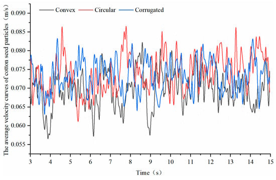 To further analyze the influence of the seeding wheel structure on the seeding process, the average velocity curves of cotton seed particles within the time steps of 3 to 15 s are shown in Figure 12. The cotton seed particle velocity with the circular-type-hole wheel is markedly lower than that of the convex and corrugated types. The fluctuation magnitude of the cotton seed particle velocity, from the largest to smallest, is as follows: convex-type-hole wheel (0.0284 m/s); circular-type-hole wheel (0.0276 m/s); and corrugated-type-hole wheel (0.0242 m/s). The relative velocity of cotton seed particles with the circular-type-hole wheel is low and the velocity fluctuates greatly. Although the convex-type-hole wheel can increase the relative velocity of the cotton seed particles, its velocity also exhibits large fluctuations. In contrast, the corrugated-type-hole wheel enhances the relative velocity of cotton seed particles while maintaining velocity fluctuations at a low level. This indicates the ability of the corrugated-type-hole wheel to improve the dibbler filling performance.