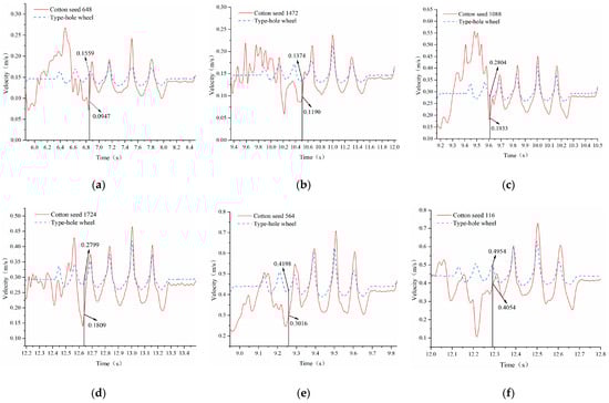 Speed of cotton seeds and type-hole wheels at different rotation speeds: (a) cotton seed 648 with the dibbler rotation speed at 10 r/min, (b) cotton seed 1472 with the dibbler rotation speed at 10 r/min, (c) cotton seed 1088 with the dibbler rotation speed at 20 r/min, (d) cotton seed 1724 with the dibbler rotation speed at 20 r/min, (e) cotton seed 564 with the dibbler rotation speed at 30 r/min, and (f) cotton seed 116 with the dibbler rotation speed at 30 r/min.