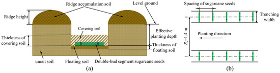 - Li, S.P.; Pan, J.F.; Zhong, J.Q.; Huang, Z.X.; Gan, F.F. Design and Experiment of Furrow Opener for Transversal Sugarcane Planter Based on Effective Seeding Space. Trans. Chin. Soc. Agric. Mach. 2022, 53, 162–170. [Google Scholar]