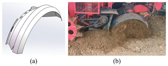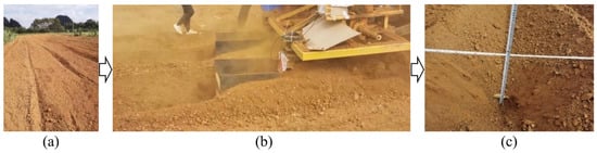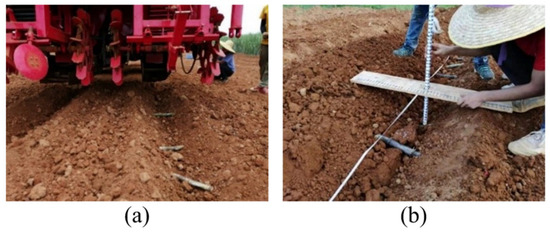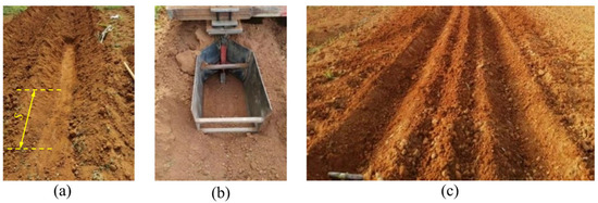 - Due to the insufficient height of furrowing plow, a large amount of floating soil flows back, resulting in a large difference between the furrow depth and the effective planting depth. Moreover, there is a large amount of agglomerated soil in the middle of the double rotary tillage gearbox due to missed tillage, as shown in Figure 3b.