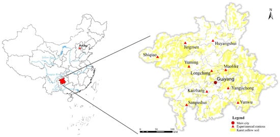 This investigation collected data from experimental stations in central Guizhou Province, southwest China. The central part of Guizhou, known as the “Qianzhong region”, consists primarily of karst hilly terrain within the Yunnan–Guizhou Plateau. The Qianzhong region encompasses 33 counties, cities, and districts of Guizhou Province, including Guiyang City, Honghuagang District, and Zunyi County, among others. This region covers an area of 53,802 km2, accounting for 31% of Guizhou Province. The area is characterized by the widespread presence of carbonate rocks of various properties, and the lithologic categories include dolomite, dolomite interlayer, interbedded dolomite and clastic rocks, non-carbonate rock, limestone, limestone sandwich, interbedded limestone and dolomite, interbedded limestone and clastic rocks, carbonatite–clastic rocks, and inter-bedded carbonate and clastic rocks, which are distributed in a staggered pattern on the extensive karst landscapes, overlapped with significant karst yellow soil (as shown in Figure 1). The average elevation in this area is approximately 1300 m, and it experiences a northern subtropical monsoon humid climate, with warm winters and cool summers, and an average annual precipitation of around 1100 mm.