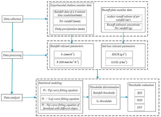 Based on the experimental stations and runoff plots monitor data, the rainfall and soil loss relevant parameters were calculated, and then, the statistical models were built for threshold determination, and the indices of , , and were used to assess the effectiveness of the thresholds. The methodological flow diagram is shown in Figure 2.