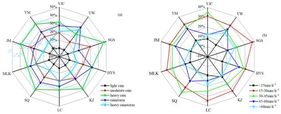 (a) Composition of erosivity ratios for different rainfall amount grades; (b) Composition of erosivity ratios for different maximum rainfall intensity within a 30-min period ().