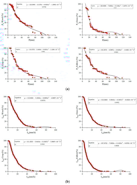 Different underlying surfaces exhibited varying erosive rainfall thresholds under the same amount of rainfall. This is both a phenomenon and a result of the research in this paper, where rainfall thresholds for four different categories of landcover types were identified through statistical modeling. The 69 plots in the study area were divided into four groups of landcover types as previously mentioned. Applications of the four steps of the procedure for determining rainfall thresholds, - scatterplots of the four landcover types were plotted, and - curve fitting equations were constructed, respectively (Figure 4a). In the - curve fitting estimation, the cubic polynomial had the goodness of fitting with statistical significance (p < 0.001, R2 >0.9328), and the cubic polynomial was selected for curve fitting in this paper. - scatterplots and curve fitting equations were also plotted and constructed, as shown in Figure 4b.