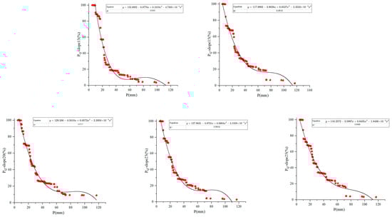 Larger rainfall thresholds for landcover types indicate less susceptibility to erosion, and smaller rainfall thresholds indicate more susceptibility to erosion. The aforementioned rainfall threshold study shows that bare land and farmland are erosion-prone areas in the karst yellow soil region. The karst yellow soil of farmland accounts for more than 30.00% of the total area, while bare land occupies less than 1.00% [49]. To enhance the relevance of research on erosion-prone areas, the rainfall thresholds for farmland were further validated under different slope gradients. The experimental farmland plots were selected with slopes of 13°, 15°, 20°, 23°, and 25°. - scatterplots of the five slope grades were plotted, and - curve fitting equations were constructed (p < 0.001, R2 ≥ 0.9291), respectively (Figure 5).