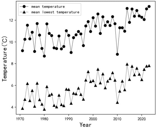 The meteorological data used in this paper were selected from 569 meteorological stations in the Huang-Huai-Hai region (29°72′ to 41°85′ N, 113°98′ to 121°65′ E), including average temperature and minimum temperature. Data were obtained from the China Meteorological Data Sharing Service System (https://data.cma.cn, accessed on 20 June 2024).