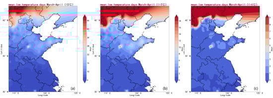 Figure 2. Regional distribution of the frequency of extremely low-temperature disasters in the Huang-Huai-Hai region. (a) Statistical map of extreme minimum temperatures below 0 °C; (b) statistical map of extreme minimum temperatures below −3 °C, (c) statistical map of extreme minimum temperatures below −6 °C.
