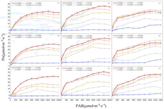 Analysis of variance (ANOVA) of photosynthetic parameters revealed that changes in Pn, Gs, and Tr in leaves of the same variety under different low-temperature (LT) treatments and in leaves of different varieties under the same LT treatments passed the analysis of significance at p < 0.05 (Tables S1 and S2). In addition, most of the coefficients of variation remained within 15%, indicating that the data were stable and informative. Under the Control (CK) treatment, cultivar C2 exhibited the highest light saturation point, surpassing cultivars C1 and C3 by 16.5% and 10.6%, respectively. Under D1 (Figure 4a–c) and D2 (Figure 4d–f) treatments, the trends of peak net photosynthetic rate (Pn) variation with temperature were relatively similar among the three cultivars. Specifically, cultivar C1 displayed a marked decrease in its peak Pn under the T4 treatment, with a significant reduction of 34.5% and 45.2% compared to the CK treatment. Notably, photosynthesis ceased in C1 under both the T2 and T1 treatments. Cultivar C2 also showed a pronounced decline in peak Pn under the T3 treatment, with reductions of 47.6% and 41.6% from the CK treatment, and photosynthesis both ceased under the T1 treatment. Cultivar C3 displayed a notable decrease in peak Pn solely under the T2 treatment, while maintaining a marginal level of photosynthesis under the T1 treatment. Under the D3 treatment (Figure 4g–i), a clear downward trend in peak Pn values was observed across all three cultivars as the temperature decreased. Notably, even cultivar C3, which had previously maintained some photosynthetic activity under certain conditions, ceased photosynthesis under the T1 treatment.