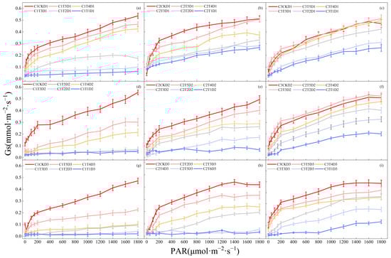 Under the control (CK) treatment, the mean Gs value of variety C3 was the lowest, exhibiting a significant reduction of 8.9% and 11.6% compared to varieties C1 and C2, respectively. Under the D1 treatment (Figure 5a–c), the stomatal conductance (Gs) of the winter wheat leaves in variety C1 exhibited a marked decrease under the T3 treatment, with its peak value dropping by 60.4% compared to the CK treatment. In contrast, varieties C2 and C3 maintained gas exchange even under the T1 treatment, albeit with reduced peak values of 44.4% and 40.9%, respectively, compared to the CK treatment. Under the D2 treatment (Figure 5d–f), the Gs of variety C1 leaves notably declined across all LT treatments. Notably, variety C3 displayed a remarkable phenomenon, in which both the mean and peak Gs values surpassed those of the CK treatment under T5 conditions. Under the D3 treatment (Figure 5g–i), the Gs of variety C1 leaves remained consistently low across all LT treatments. Notably, variety C2 ceased gas exchange under T2 and T1 treatments, whereas variety C3 sustained minimal gas exchange, even under T1 treatment.