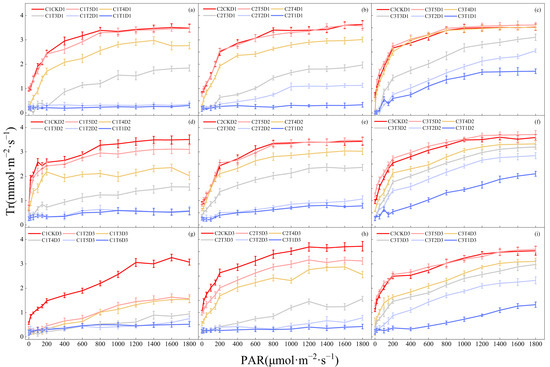 Under the D1 treatment (Figure 6a–c), the mean transpiration rate (Tr) of leaves from both the C1 and C2 varieties significantly decreased under the T3 treatment, with peak reductions of 47.1% and 42.8%, respectively, compared with the control (CK) treatment. Notably, the leaves of variety C1 ceased transpiration under T2 and T1 treatments, whereas those of variety C2 halted transpiration only under the T1 treatment. In contrast, the leaves of variety C3 maintained a remarkable transpiration rate, achieving a peak value of 37.8% of the CK peak, even under the T1 treatment. Under the D2 treatment (Figure 6d–f), the trends in the mean and peak values of the transpiration rate (Tr) across the leaves of the three varieties followed a similar pattern to that observed under the D1 treatment, with a slight further decline as the intensity of LT stress increased. The D3 treatment (Figure 6g–i) had the most pronounced effect on the leaf transpiration rate (Tr) of variety C1. Specifically, under the T5 treatment, the maximum Tr value for C1 leaves reached 1.63 mmol·m−2·s−1, representing a notable decrease of 49.1% compared to the CK treatment. For variety C2, a significant decline in Tr was observed under T4 and T3 treatments, with peak reductions of 28.6% and 36.1%, respectively, compared to the D2 treatment. In contrast, the mean and peak Tr values for variety C3 remained relatively unchanged compared to those under the D2 treatment.