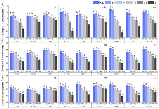 Figure 7. Changes in pigment content in leaves of different winter wheat varieties under low-temperature stress. (ac) represent the changes in chlorophyll A (Chla) content in the leaves of “Zhenmai 12” (C1), “Jimai 22” (C2), and “Shannong 38” (incorrectly labeled as C2, which should be C3) under different low-temperature stresses for durations of 2 days (D1), 4 days (D2), and 6 days (D3), respectively. (df) represent the changes in chlorophyll B (Chlb) content in the leaves of “Zhenmai 12” (C1), “Jimai 22” (C2), and “Shannong 38” (C3) under different low-temperature stresses for durations of 2 days (D1), 4 days (D2), and 6 days (D3), respectively. (gi) represent the changes in carotenoid (Car) content in the leaves of “Zhenmai 12” (C1), “Jimai 22” (C2), and “Shannong 38” (C3) under different low-temperature stresses for durations of 2 days (D1), 4 days (D2), and 6 days (D3), respectively. Measurements were performed in triplicate, representing each value as “mean ± standard deviation (SD).” Note: According to Duncan’s test, lowercase letters indicate significant differences at p < 0.05.