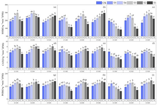 Figure 8. Changes in protective enzyme activities in the leaves of different winter wheat varieties under low-temperature stress. (ac) show the changes in superoxide dismutase (SOD) activity in the leaves of “Zhenmai 12” (C1), “Jimai 22” (C2), and “Shannong 38” (C3) under different low-temperature treatments with durations of 2 days (D1), 4 days (D2), and 6 days (D3), respectively. (df) show the changes in catalase (CAT) activity in the leaves of “Zhenmai 12” (C1), “Jimai 22” (C2), and “Shannong 38” (C3) under different low-temperature stresses with durations of 2 days (D1), 4 days (D2), and 6 days (D3), respectively. (gi) show the changes in peroxidase (POD) activity in the leaves of “Zhenmai 12” (C1), “Jimai 22” (C2), and “Shannong 38” (C3) under different low-temperature stresses with durations of 2 days (D1), 4 days (D2), and 6 days (D3), respectively. Measurements were performed in triplicate, representing each value as “mean ± standard deviation (SD)”. Note: According to Duncan’s test, lowercase letters indicate significant differences at p < 0.05.