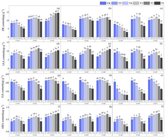 Figure 9. Changes in endogenous hormone content in the leaves of different winter wheat varieties under low-temperature stress. (ac) show the changes in zeatin riboside (ZR) content in leaves of “Zhenmai 12” (C1), “Jimai 22” (C2), and “Shannong 38” (C3, though mislabeled as C2 in the figure) under different low-temperature treatments for 2d (D1), 4d (D2), and 6d (D3), respectively. (df) represent the changes in indole-3-acetic acid (IAA) content in leaves of the same wheat varieties under the same low-temperature stress durations. (gi) show the changes in gibberellin (GA) content in the leaves of wheat varieties under the same stress conditions. (jl) show the changes in abscisic acid (ABA) content in the leaves of the wheat varieties under the same stress duration. Measurements were performed in triplicate, representing each value as “mean ± standard deviation (SD)”. Note: According to Duncan’s test, lowercase letters indicate significant differences at p < 0.05.