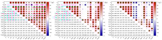 Figure 10. Correlation analysis of different trait indices under low-temperature stress. (a) shows the correlation analysis of various indices of “Zhenmai 12” under different low-temperature stresses, (b) shows the correlation analysis of various indices of “Jimai 22” under different low-temperature stresses, and (c) shows the correlation analysis of various indices of “Shannong 38” under different low-temperature stresses. *** denotes a highly significant correlation at p < 0.001, ** denotes a significant correlation at p < 0.05, * denotes a significant correlation at p < 0.1.