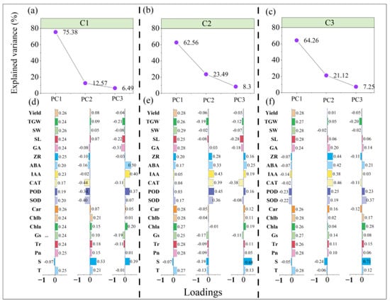 Principal component analysis was conducted on 19 indicators, including temperature, duration, photosynthetic parameters, photosynthetic pigment content, protective enzyme activity, endogenous hormone content, yield, and its component factors, for the three winter wheat varieties. The scree plots and factor contribution rates are depicted in Figure 11. The results showed that the cumulative variance contribution rate of the first three components for variety C1 reached 94.5%, for variety C2 it reached 94.4%, and for variety C3 it reached 92.6%. All of them met the criteria of having an eigenvalue greater than 1 and a cumulative variance contribution rate greater than 85% [47]. Selecting the first three principal components can effectively explain more than 90% of the variation in the original 19 indicators (Table S10).