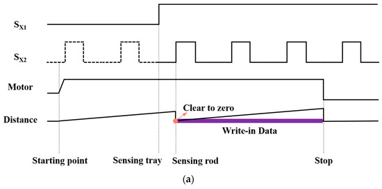 The working time sequence of seedling tray positioning is shown in Figure 3a; the motor starts to run, the push rod pushes the seedling tray forward and, when the first sensor is triggered, the second sensor is activated. The fixed displacement corresponding to different seedling trays is taken as the written data DW, and the seedling trays are finally transported to the designated position.