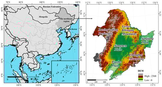 Northeast China, located at 38°43′–53°33′N and 115°53′–135°5′ E, is a rich black soil region in the Northern Hemisphere. It covers Heilongjiang, Jilin, and Liaoning provinces, as well as parts of Inner Mongolia, including Chifeng, Tongliao, Hulunbuir, and Xing’an League. This area spans 1.09 million km2, accounting for 12% of the global black soil area []. The region, characterized by mountainous terrain to the east, west, and north, features undulating hills, gentle slopes, and low-lying plains, with elevations from sea level to 2368 m (Figure 1). It experiences a temperate continental monsoon climate with distinct seasons: warm, humid summers and cold, dry winters. The mean annual temperature is around 3 °C, with the accumulated temperature units ranging between 1500 and 3800 °C []. Rainfall, mainly occurring from July to September, ranges from 300 to 1000 mm annually, transitioning from semi-arid to semi-humid regions from west to east []. The region is renowned for its rich black soil resources, with 18.533 million hectares of prime arable land []. The dominant soil types include black soil, dark brown soil, brown soil, black calcareous soil, chernozem, and meadow soil []. The main crops are maize, soybeans, and rice. Since 2000, northeast China has contributed 50.71% of the national increase in grain production [], cementing its role as a key strategic and commercial grain production hub for the country.