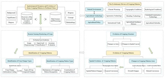 Research framework for the spatiotemporal dynamics and evolution of grain cropping patterns in northeast China.