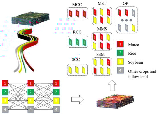 Mechanisms of recognizing cropping patterns. MCC, continuous maize cropping; RCC, continuous rice cropping; SCC, continuous soybean cropping; MSR, maize–soybean rotation; MST, maize–soybean 2-year rotation; MMS, maize–maize–soybean 3-year rotation; SSM, soybean–soybean–maize 3-year rotation; OP, other cropping patterns.