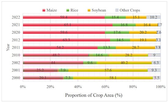 In northeast China, maize, soybeans, and rice were the primary dominant grain crops, both spatially and temporally. Moreover, there were some economic crops such as potatoes, sugar beets, and miscellaneous grains, which, although diverse, accounted for a smaller proportion and were therefore categorized as “other crops”. As shown in Figure 5, since 2000, the characteristics of the evolution of the scale of various crops exhibited differentiation. Specifically, the proportion of the sown area of maize showed a significant increasing trend, which gradually stabilized by 2012. Conversely, the proportion of the sown area of soybeans exhibited a complementary relationship with that of maize, showing a significant decrease initially and then stabilizing after 2012. Furthermore, the proportion of rice planting areas generally showed an increasing trend, peaking and stabilizing in 2011. In contrast, the proportions of the area of other crops and fallow land were relatively disorderly, indicating that natural, social, and other factors greatly influenced the sowing of these crop types.