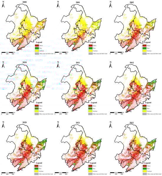 The spatiotemporal differentiation in the patterns of crop planting structures in northeast China was significantly distinct. As shown in Figure 6, the dominant type in the initial spatial layout was soybeans, characterized by a distribution of dense in the north and sparse in the south. However, this dominant spatial pattern was gradually replaced by maize over the years. Consequently, the abundant planting areas of soybeans, mainly in the northern Liaohe Plain and the central Songnen Plain, gradually decreased. Since 2002, the spatial layout has been dominated by maize and has remained stable. Furthermore, in terms of spatiotemporal differentiation, the area planted to maize expanded from south to north, while planting to soybean contracted in the south and concentrated in the north, with their distribution areas constantly changing in a relationship of mutual advance and retreat over the past 20 years. Moreover, the patches of rice planting were predominantly focused on the Liaohe Plain and the Sanjiang Plain. Over the years, its spatial distribution changed from scattered to aggregated patches, and from 2012 onwards, it remained basically stable.