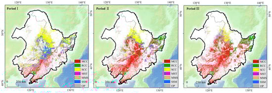 Distribution map of cropping patterns in northeast China from Period I to Period III.