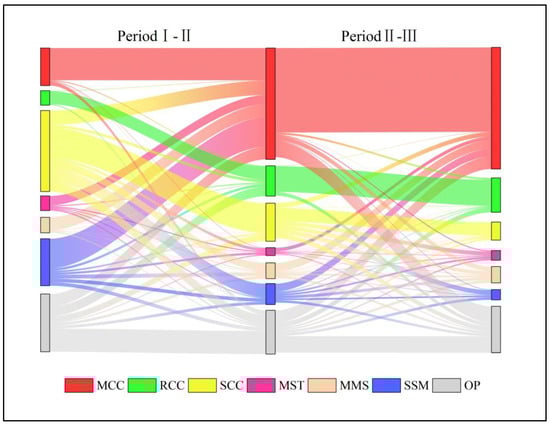 In the shift from Period II to Period III, MCC experienced the most transfers out, primarily shifting to OP, totaling 21,467.00 km2. Simultaneously, MCC again received the most transferred area, amounting to 48,995.50 km2, with 33.49% coming from OP, the largest share of the transfers.